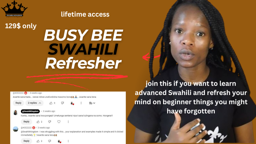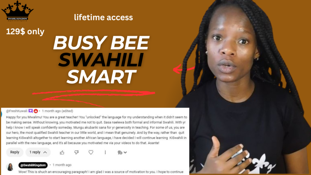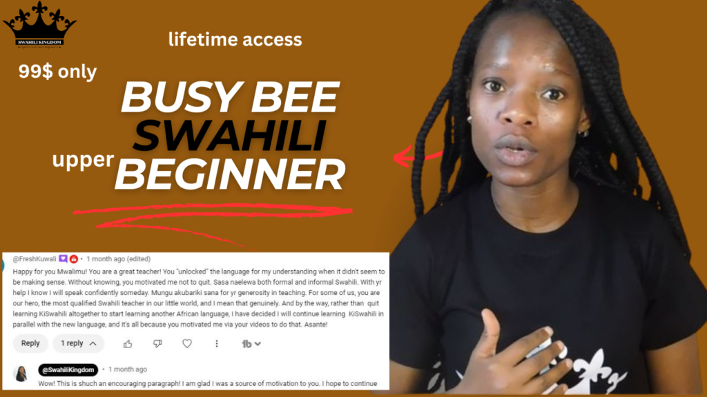 You will learn and acquire Swahili vocabulary, phrasal verbs, and pronunciation that real native Swahili speakers use, and you can join other course members on Discord every Sunday at 6 p.m. East African time to speak confidently together.